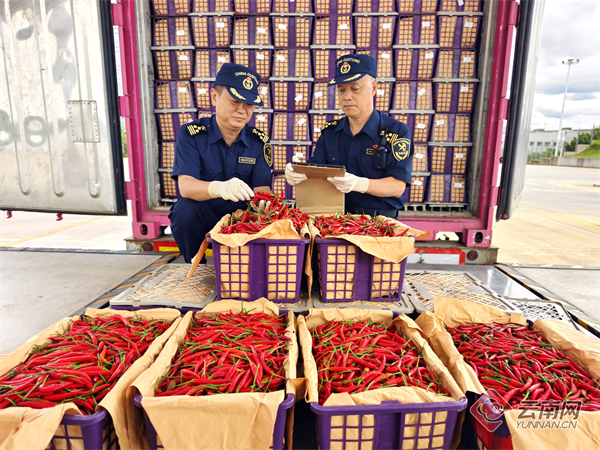 海关关员在红河综保区出口农产品综合服务中心对出口辣椒进行查验。刘异 摄