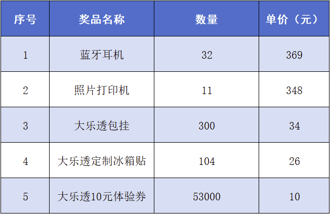 活动期间,用户进入活动页面使用抽奖机会进行抽奖将有机会赢取照片打印机、蓝牙耳机、大乐透冰箱贴、大乐透定制包挂、超级大乐透10元体验券等惊喜好礼,奖品每日限量抽取,先到先得,领完即止。