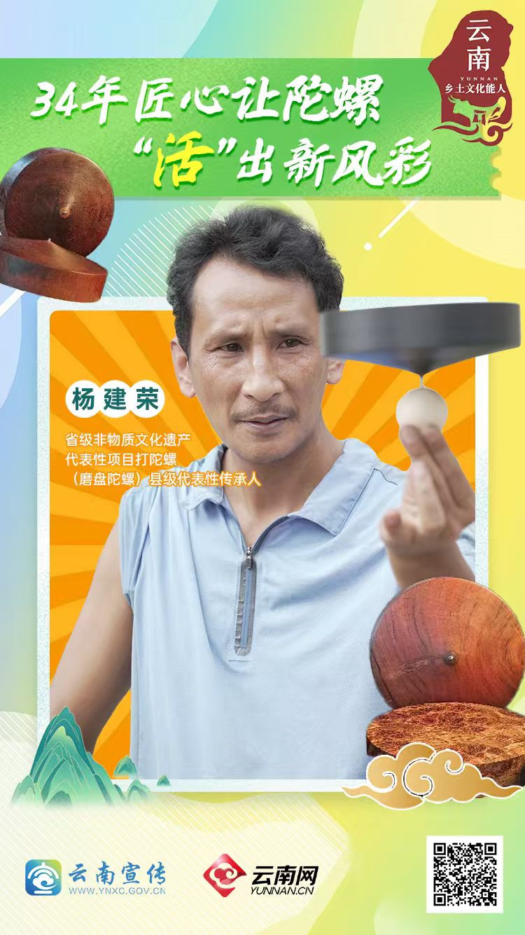 在杨建荣的带动下,镇康县逐渐构建起“传承人+骨干+爱好者”的非遗人才梯队,目前已有像他一样的县级传承人8人、骨干300余人、爱好者上千人,形成了一支结构合理、活力充沛的传承队伍。县里还建立了非物质文化遗产代表性传承人师徒结对机制,通过设立津贴、建设传习基地,定期开展技艺培训,为陀螺文化注入源源不断的“新鲜血液”。