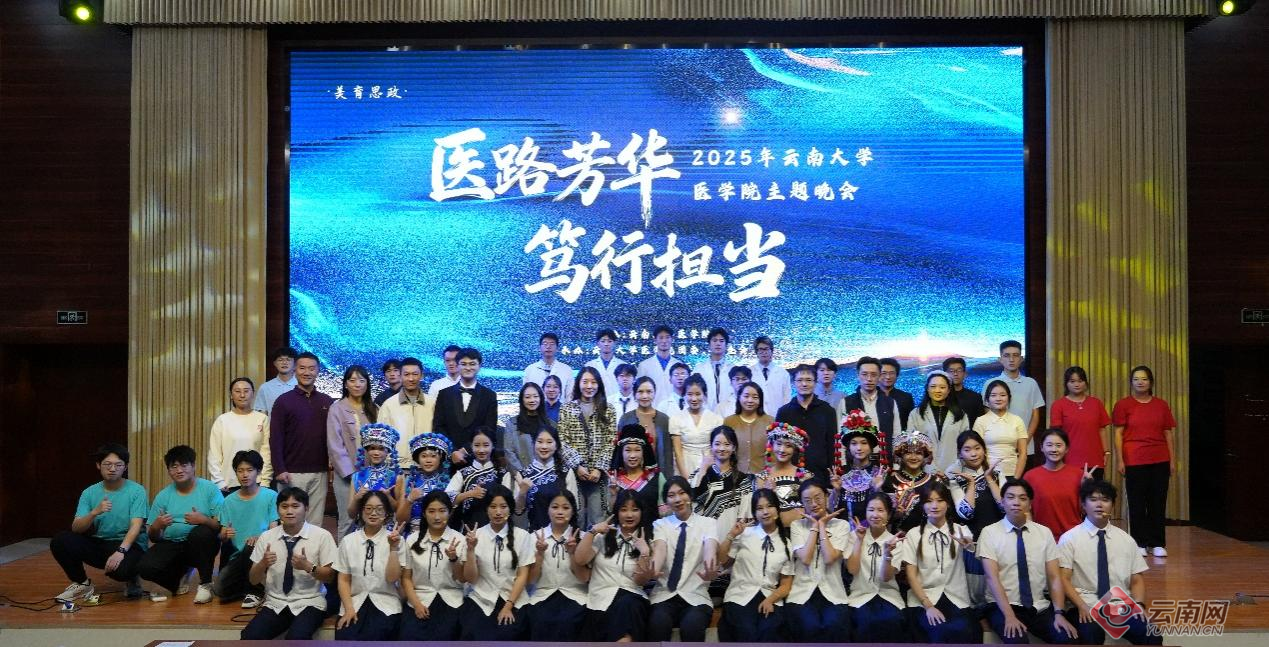2025年10月25日,云南大学医学院举办“医路芳华·笃行担当”主题晚会。本场晚会由医学院党委指导,医学院团委、学生会承办。晚会以美育为桥梁、思政为内核,将医学使命、时代责任与青春担当巧妙融入艺术表达,让医学生在美的浸润中坚定理想信念、在思政的启迪下凝聚奋进力量,为医学生打造别开生面、直抵心灵的“沉浸式”美育思政大课堂。