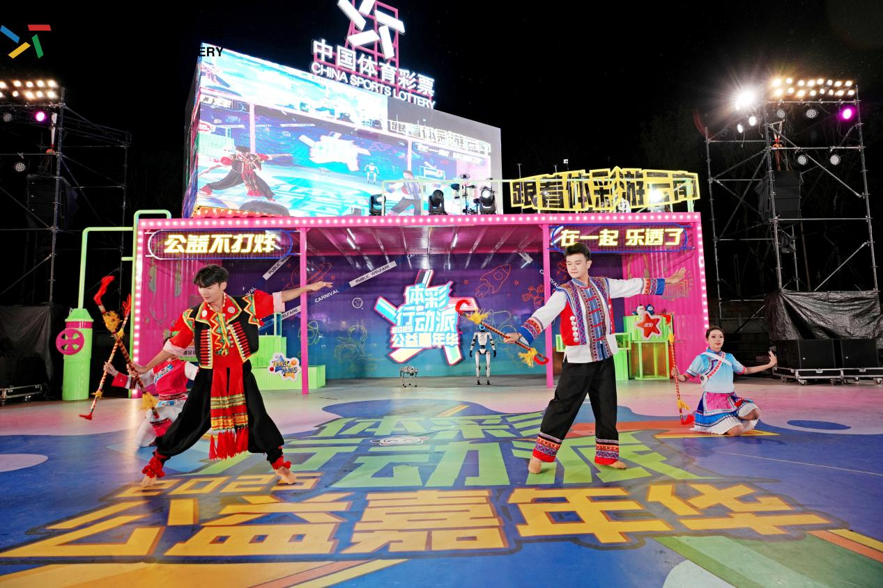 与之呼应的是晚间舞台的开场秀——省级非遗代表性项目霸王鞭的演出,铿锵的舞步与韵律,敲响了千年民族文化的时代强音,与后续充满活力的说唱、近景魔术、泡泡秀等潮流节目同台竞演,共同诠释了体彩公益“传承与创新并举”的姿态。