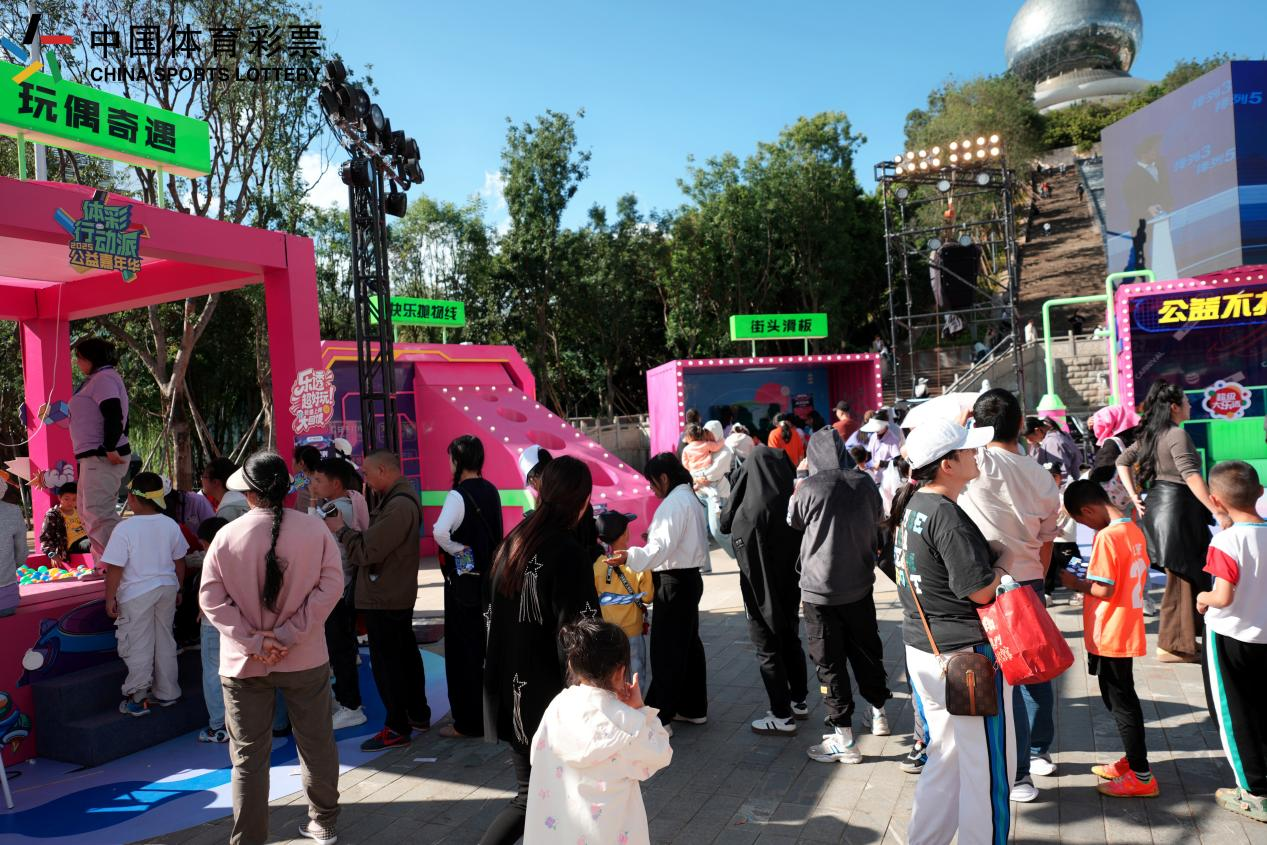 从白天的趣味游园到夜晚的视听盛宴,嘉年华现场始终洋溢着热烈与欢笑。白天,“弹珠马拉松”“街头滑板”“快乐抛物线”等互动游戏区排起长龙,家庭成员们通过合作集章,在运动中感受公益的乐趣。夜幕降临,主舞台成为焦点。乐队演奏引发全场共鸣,说唱表演唱响公益新声,《竞·彩》拉拉操舞动体育活力……贯穿其中的多轮互动问答与精彩游戏瞬间,更让快乐与幸运彩票一同传递到观众手中。