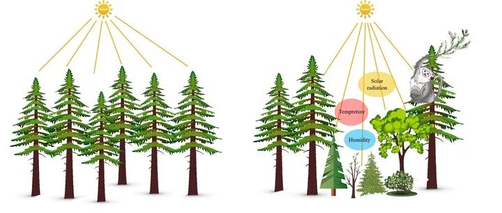 没有滇金丝猴的区域,林窗较小,植物群落单一(左图);滇金丝猴活动的区域,因其取食等行为折断林冠树枝,增大林窗,改变林下气候条件,增加了生物多样性且优化了森林结构(右图)。