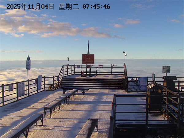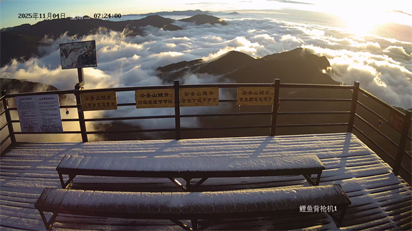 景区监控视频显示,降雪过后,轿顶观景台等地已覆盖上一层薄薄的白色积雪,山色空蒙,景致别样。至11月4日清晨7时许,轿顶区域在持续低温下,首场积雪得以保留。此时,天际泛起金色霞光,与翻涌的云海、洁白的积雪交相辉映,形成“晨光、云海、冰雪”同框的难得景象。