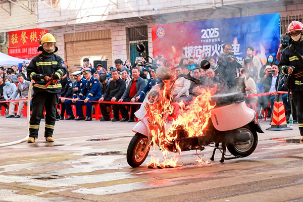 理论宣讲后,实景实验环节将活动推向高潮。在电动车电池穿刺燃烧试验环节,消防员用专业工具刺穿电池。短短数秒内,电池便开始冒烟起火。
