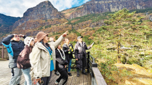 随后,师生从大黑箐出发,沿研学路线深入景区,在专业人员带领下观察针叶林、高山灌丛等植被特征,探访高山瀑布、花溪等景观,通过摄影、手绘等方式采集素材。同学们表示,实地探访让生态数据变得鲜活,大家深化了对生态保护的理解,激发了创作灵感。