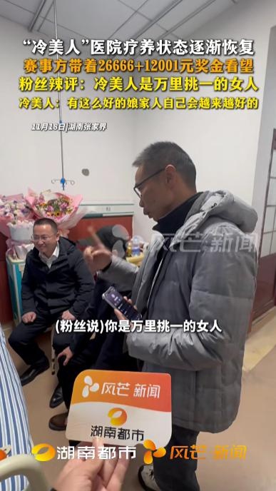 11月18日,“冷美人”疗养状态逐渐恢复,赛事方带着26666元+12001元奖金到医院看望“冷美人”。“冷美人”感谢大家关心,称现在头发是最大的难题,变“石头”了,还自嘲是否能做“形象大使”。