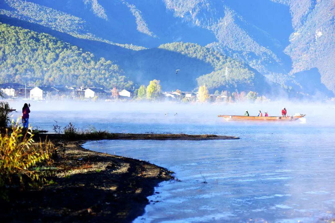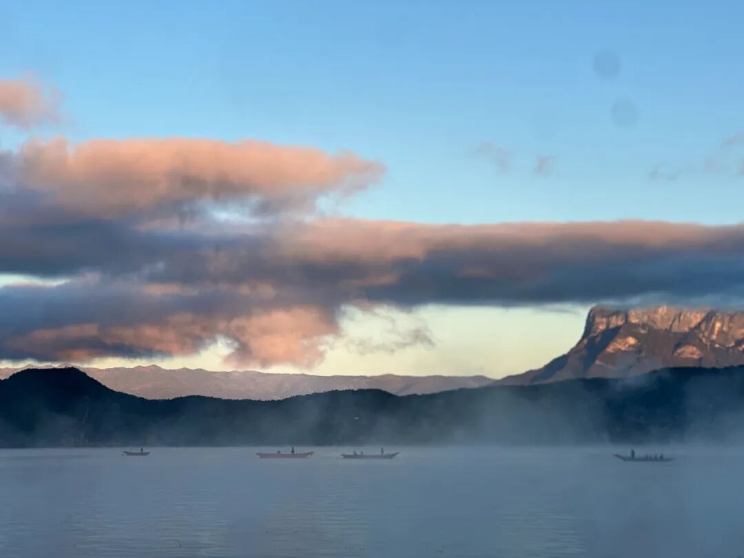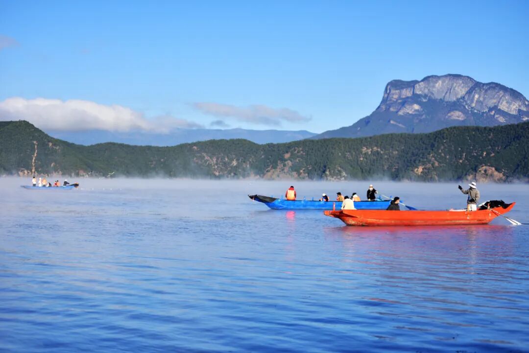 今日泸沽湖的清晨,晨雾与日出交织成一幅绝美的山水画卷,让早起的游客沉浸式体验“人在画中游”的仙境之感。这一秋冬季节特有的景观,成为泸沽湖最动人的自然馈赠。