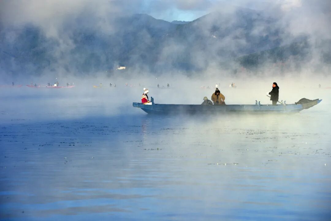 湖上、岸边,众多摄影爱好者与游客早已驻足,快门声此起彼伏,记录下这转瞬即逝的美景。乘坐猪槽船游湖的游客更是身处画芯,船桨轻摇,波纹扩散,四周雾霭流动,宛若闯入清幽秘境,伸手便可触摸凉丝丝的雾霭,仿佛与天地灵气相通。