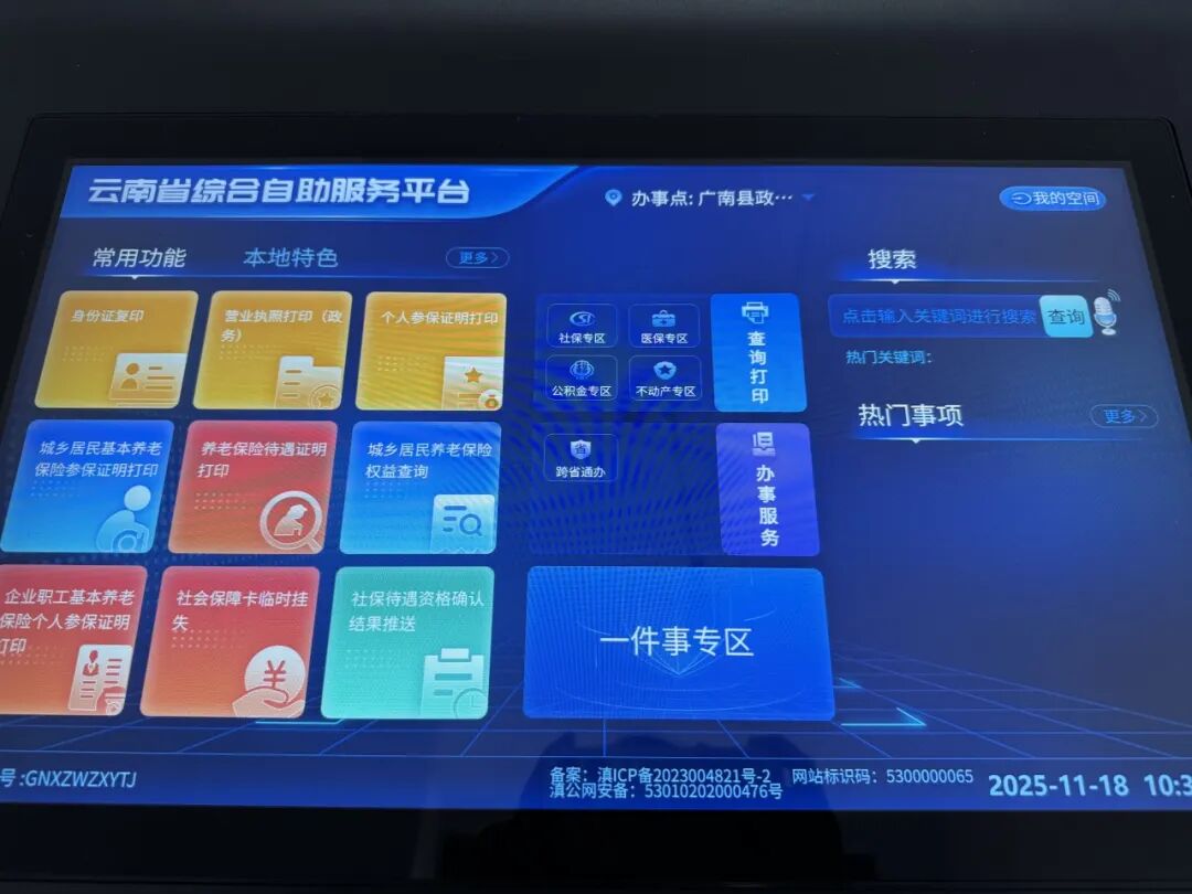 走进广南县政务服务中心大厅,可视化大屏上的信息实时滚动、清晰直观,取号队列进度、各窗口办理状态、办件量排行等核心数据一目了然,为办事群众提供精准指引,也为大厅运营调度提供数据支撑。中心配置了取号机、查询机、楼层引导机、自助服务终端、自助填单机、自助存取等智能化设备18台,方便企业和群众办事及信息查询。