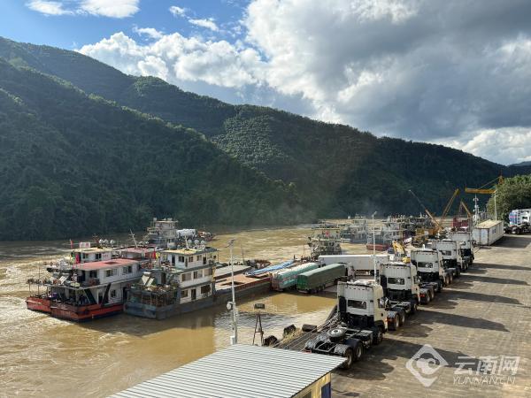 在距离磨憨口岸百余公里的关累港口岸,记者看到了同样繁忙的景象。澜沧江边,吊车正在将即将出口缅甸的货车头调往货轮,另一边的榴莲、西瓜等水果也在离开货轮后运往指定监管场地。