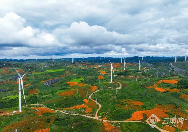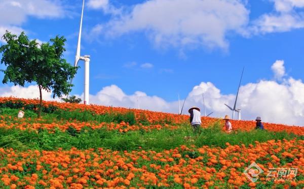 依托高原山地百万千瓦风电基地的壮观场景,地企携手打造“高原能源观光带”。围绕牛屎坡3A级景区,通过土地整合与规模化种植,连片打造3600亩万寿菊观光带,形成集能源科普、生态观光、农事体验于一体的农旅融合示范区。