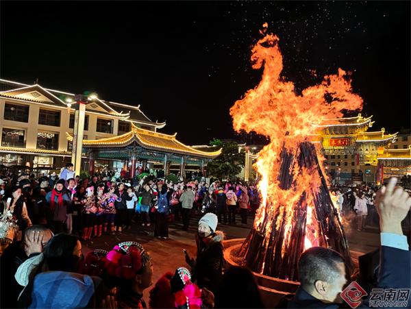 11月28日,市民游客围着篝火唱彝歌、跳彝迪。记者 王剑钊 摄