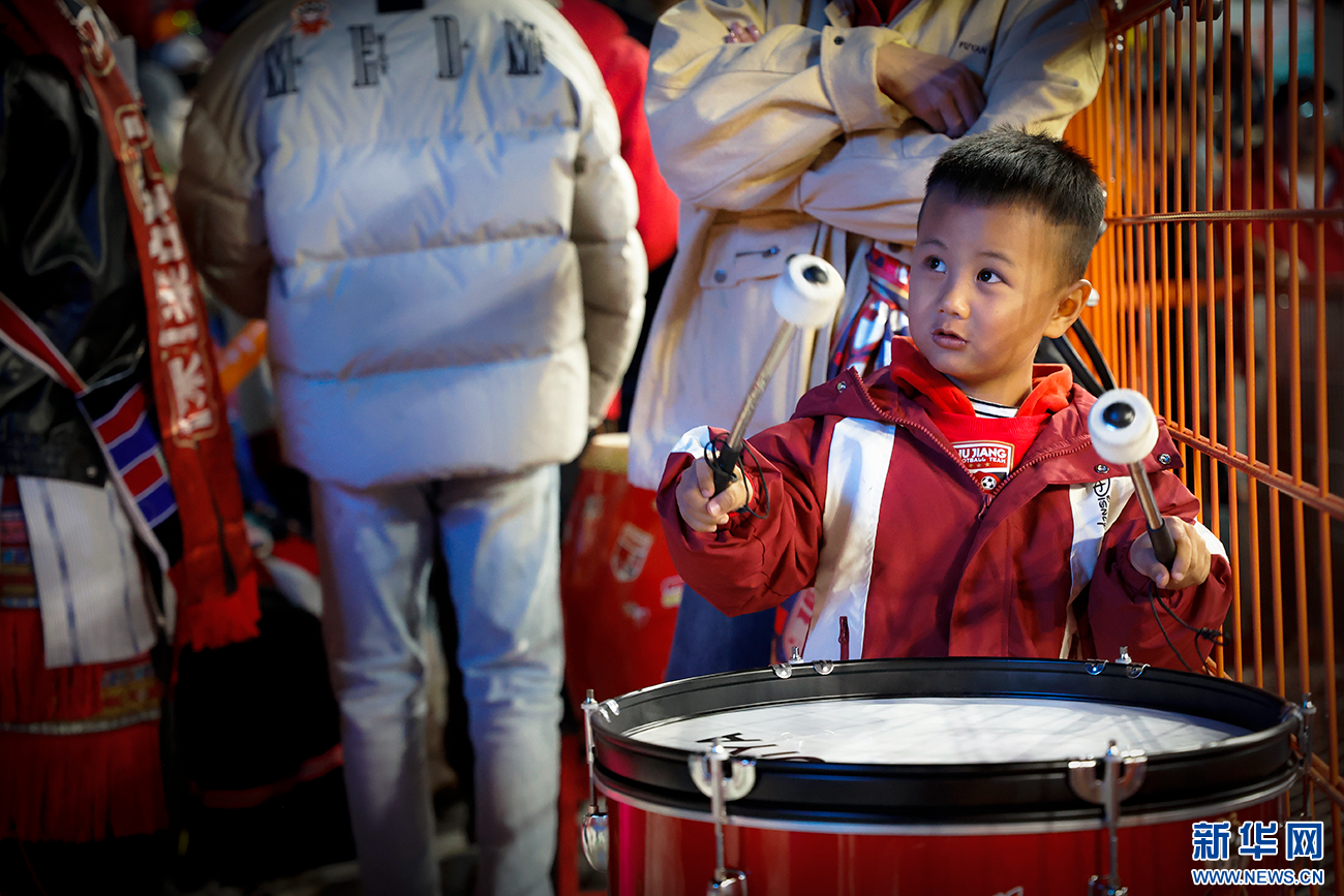 “滇超”赛场上为支持队伍打鼓的“小球迷”(11月29日摄)。新华网发(丁凝 摄)