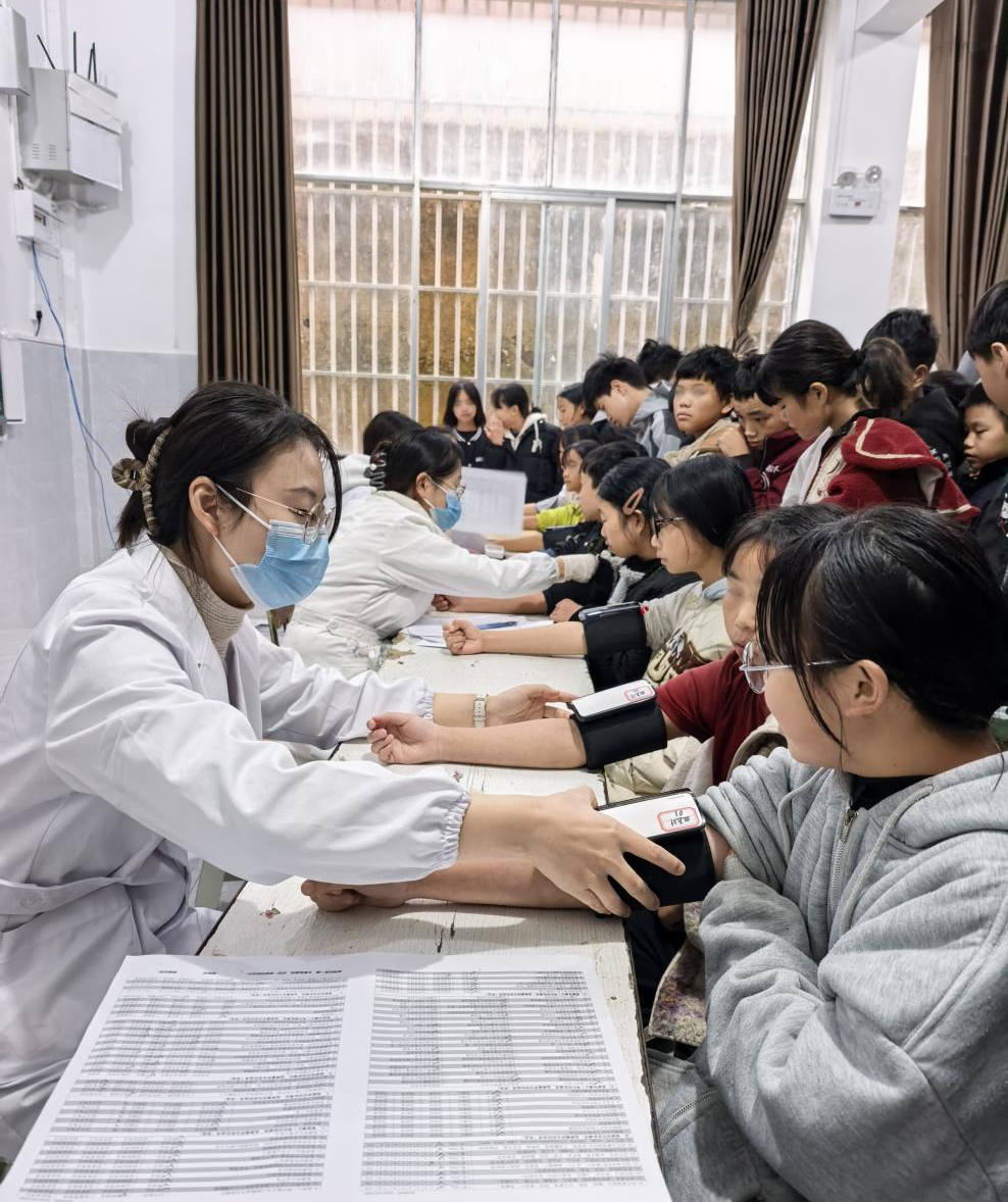 本次活动重点聚焦边疆青少年身心健康,通过多学科协作模式,为2500余名学生提供涵盖生理与心理的综合健康服务。活动内容包括血压测量、营养状况评估、脊柱侧弯筛查以及心理健康测评。团队中的脊柱外科学博士对学生脊柱发育情况进行一对一临床评估,健康评估专业人员依据测量数据,科学分析青少年营养与血压水平。同时,心理学专业人员通过面对面交流及标准化量表,系统评估学生的心理健康状态,并对存在风险的学生实施及时、专业的心理疏导。其间,团队还开展了系列健康教育,普及健康知识,引导学生树立科学健康观念,远离危害健康的风险行为,切实将“健康第一”的教育理念融入校园。