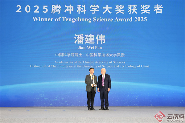 2025腾冲科学大奖获奖者潘建伟院士上台领奖。记者 雷桐苏 陈飞 高吴双 摄