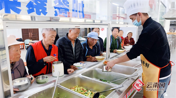 老年幸福食堂里排队打饭的老年人。付兴华 摄