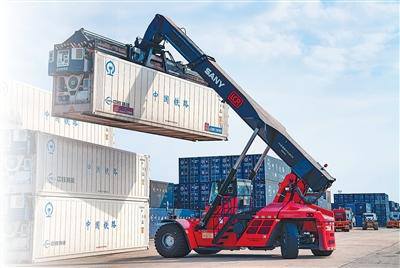 在中老铁路万象南货运口岸站,起重机吊起即将发往中国的冷链集装箱。亚太中心分社 苏朋 摄