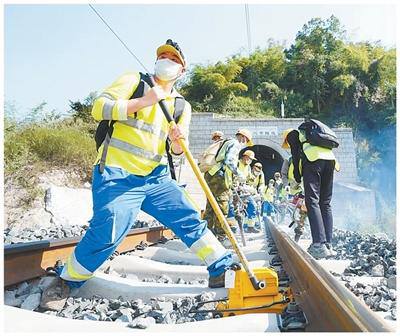 中老铁路线路工在隧道口开展起道捣固作业。周星 摄