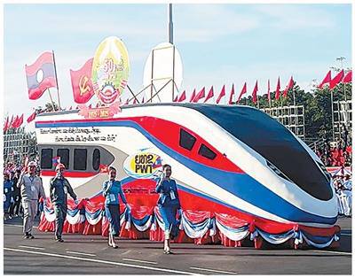 12月2日,以中老铁路“澜沧号”动车组车头为造型的花车亮相老挝建国50周年庆祝活动。米巴萨 摄