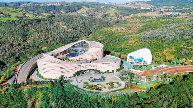 群山环抱、绿意盎然,氤氲的雾气缭绕林间,在华宁象鼻温泉度假村内,游客们正享受着温泉带来的惬意。