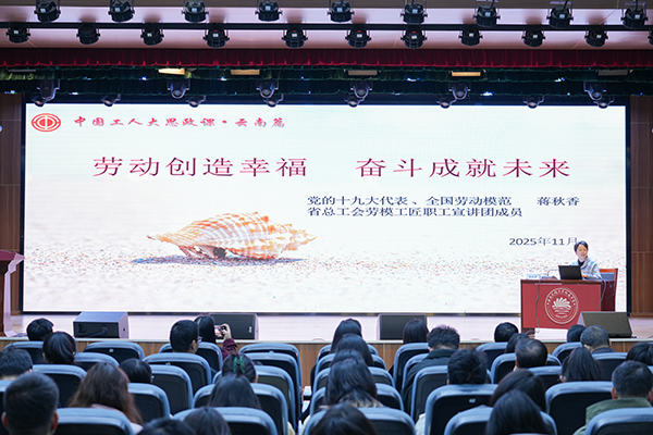 全国劳模蒋秋香以《劳动创造幸福 奋斗成就未来》为题,从云南宣威一名农村追梦女孩成长为云南纺织集团股份公司副厂长、工会副主席、省人大代表、党的十九大代表等亲身经历出发,将个人的“奋斗纤丝”与国家发展的“时代锦缎”紧密编织。她系统阐释了二十届四中全会的里程碑意义,并紧扣“高质量发展”“新质生产力”“教育强国”“绿色发展”等“十五五”关键部署,结合产业实际进行了鲜活解读。她强调,无论是国家宏图还是个人梦想,都必须依靠脚踏实地、久久为功的劳动来成就。