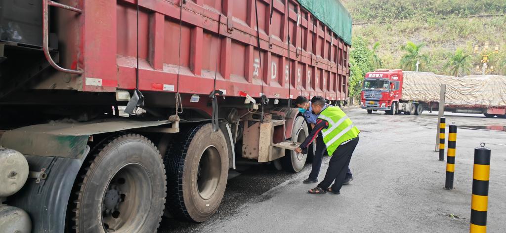 一辆挂山东牌照、满载货物的货车正在接受检查。货车驾驶员说,他经常往返中越两国,主要运输农产品和化肥等货物。“现在网上报关方便,手续齐全,检查高效,不到10分钟就检查完。”这名驾驶员说。