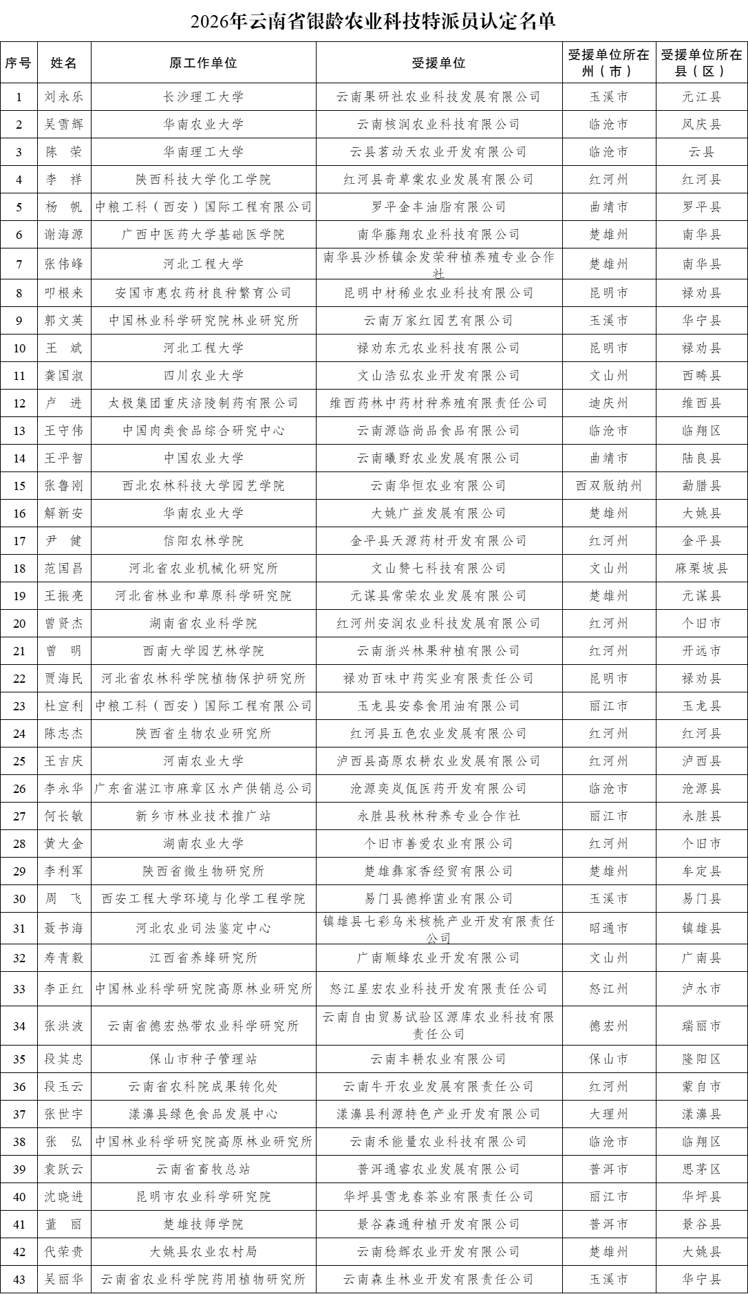 云南网讯(记者 高祎祎)1月6日,云南省科学技术厅发布通知,根据《云南省新时代“银龄人才万人计划”实施方案》《云南省科技计划项目管理办法》《云南省科技特派员管理办法》等规定,认定43名同志为2026年云南省银龄农业科技特派员,认定有效期为3年,自2026年1月至2028年12月。
