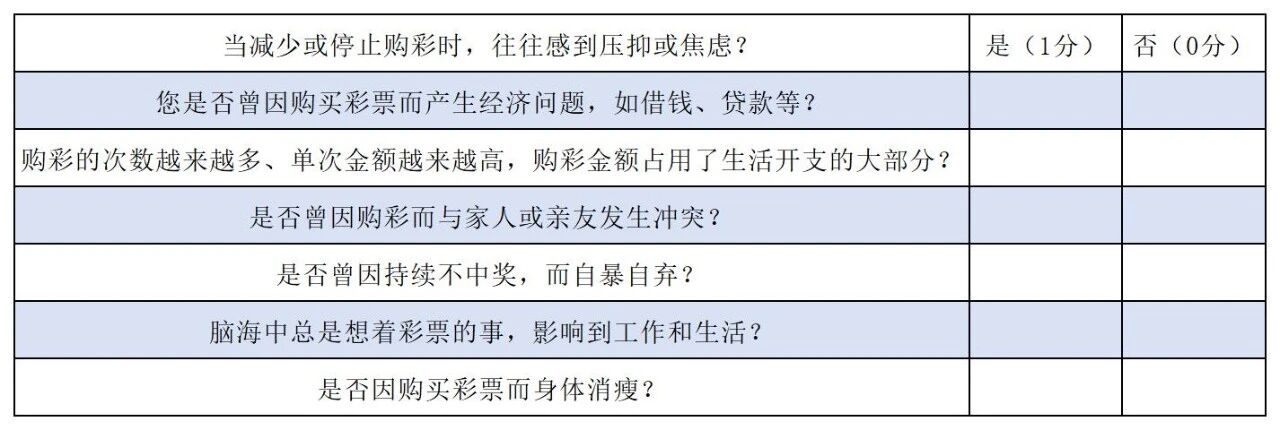 注:若最终得分≥2分,则说明您可能存在非理性购彩问题,建议您适度减少在彩票上投入的时间和金钱,必要时可向专业人士寻求帮助。