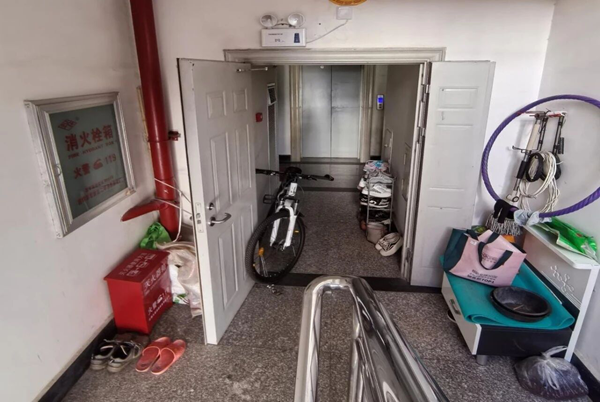 道隐患问题:一单元10层楼道内堆放鞋架等生活用品、停放自行车,占用疏散通道;四单元一楼门口停放电动车。