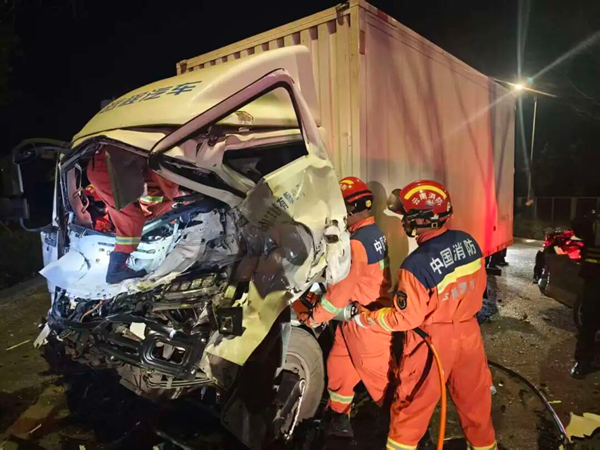 因受到猛烈撞击,被困驾驶员所在车辆驾驶室严重变形,驾驶员被变形的车体结构牢牢卡住,无法自行脱身。