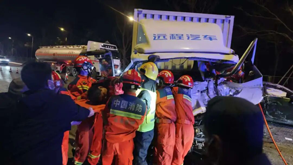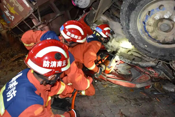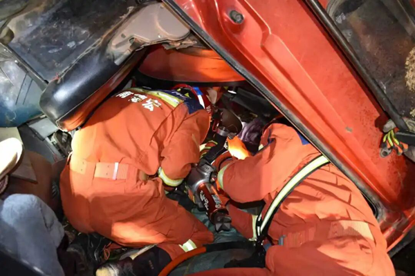 1月17日,位于云南滇中新区G320国道与惠泽街交叉口,一辆货车与小轿车相撞货车车头损毁严重,驾驶员被困驾驶室。消防救援人员利用液压剪扩器、液压顶杆等破拆工具,对驾驶室进行扩张破拆,进一步扩大救援空间。