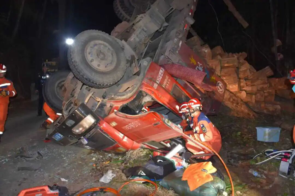 1月16日,德宏州陇川县清平乡新山村委会毛家寨路段,一辆木料运输货车在急弯处因车速过快,发生倒翻1人被困驾驶室内。