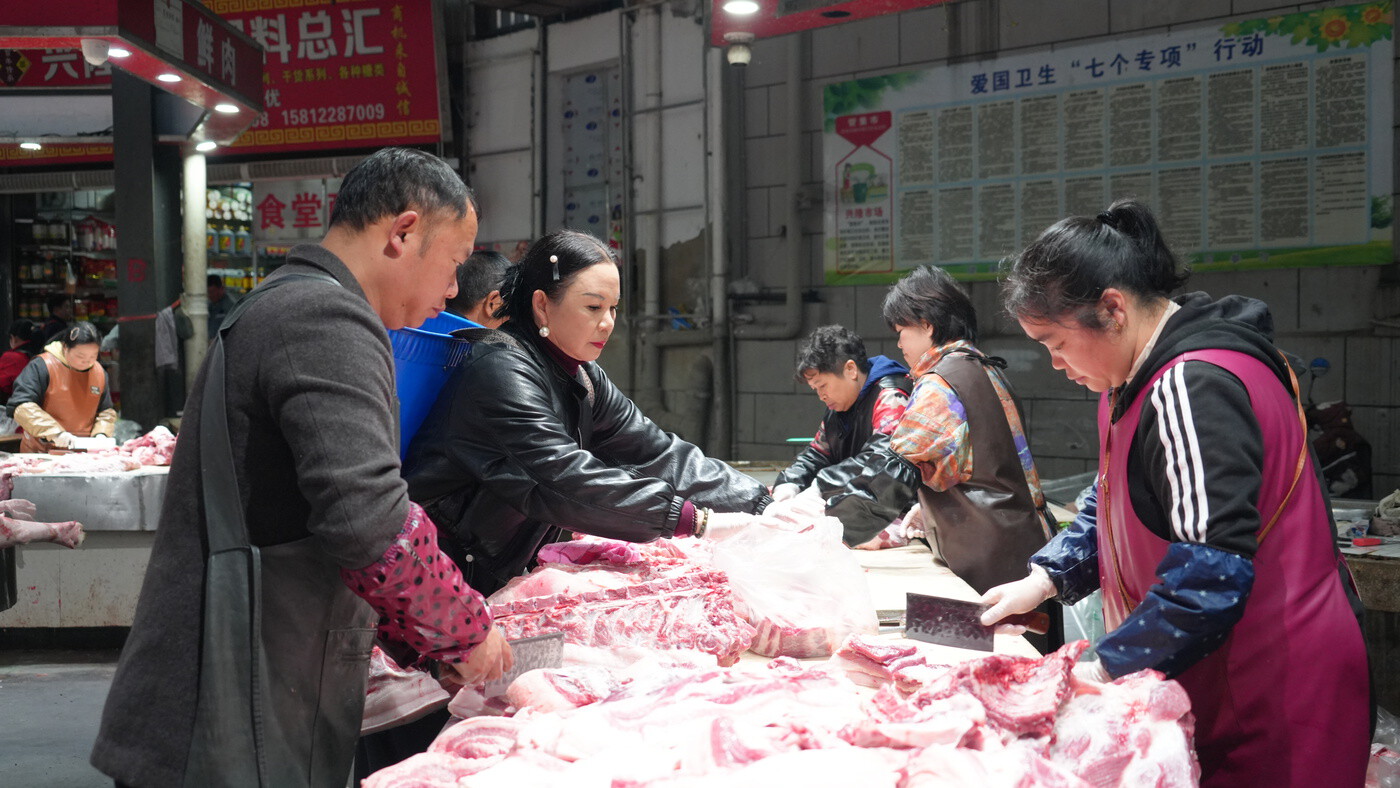 清晨的农贸市场早已人头攒动,市民们穿梭在肉摊之间,精心挑选新鲜猪肉。前夹肉肥瘦相间,五花肉脂香醇厚,都是制作油炸肉的上好选材。