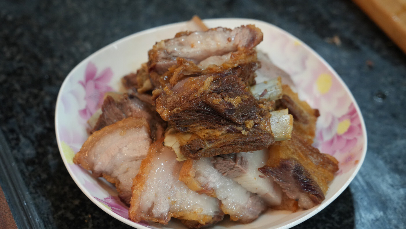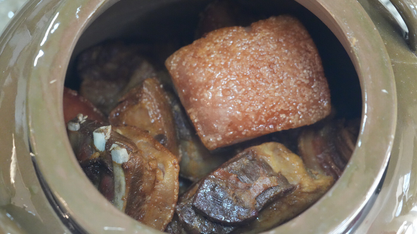制作油炸肉,每一步都饱含马关人的生活智慧。先将猪肉切成大小均匀的块状,用盐和香料反复揉搓入味,腌制一至两天;再将腌好的肉块用温水洗净,冷油下锅,随着油温慢慢升高,不时翻动防止粘连;待肉块炸至金黄酥脆,捞出控油。为了延长保存时间、激发更浓郁的香气,马关人还会把炸肉装入陶罐,将锅中的热油烧至冒烟,趁热舀入罐中浸泡。经过这番处理的油炸肉,风味愈发醇厚,无论是切片蒸热,还是搭配辣椒、蔬菜同炒,皆是令人回味无穷的佳肴。