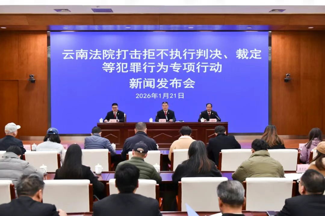 1月21日,云南法院召开打击拒不执行判决、裁定等犯罪行为专项行动新闻发布会,并发布5个典型案例。云南高院党组成员、执行局主要负责同志通报专项行动阶段性成果,执行局有关负责同志解读典型案例。发布会由新闻办主要负责同志主持。