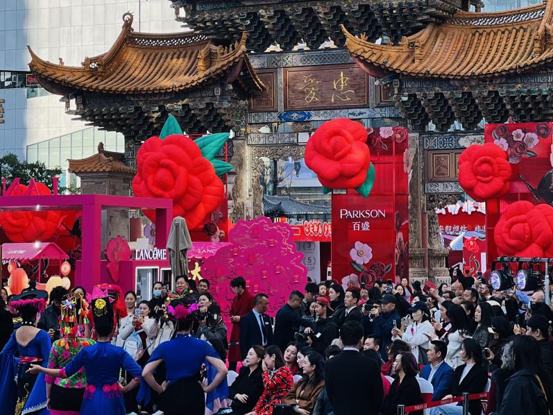 本次庆典以“百花盛开”为意象,象征百盛在昆明扎根本土、枝繁叶茂的发展历程。庆典以一场精致的非遗华服秀开启,模特身着融合民族传统与当代设计的服饰,演绎出一幅流动的文化画卷。活动邀请广大市民、百盛合作伙伴、会员代表同赏非遗华服秀,共走百花盛开路。除“百花盛开”大型艺术装置外,昆明百盛在忠爱坊广场铺出百米山茶花路。昆明百盛也向全国游客发出了“来春城,走花路”的文旅邀约。