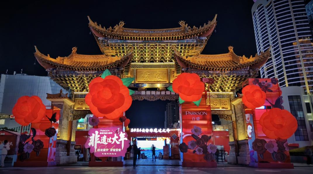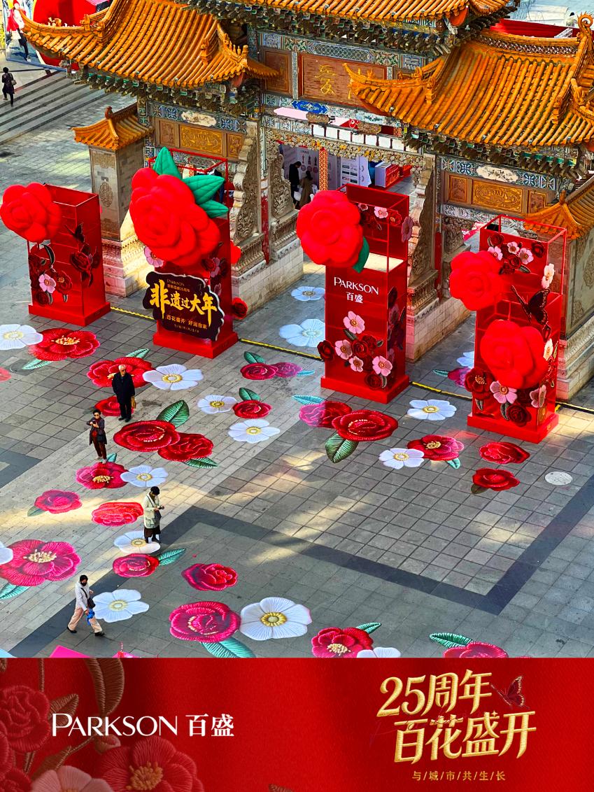 据介绍,昆明百盛自2001年入驻昆明以来,始终与城市发展同频共振,陪伴春城人民走过美好时光。25年间,百盛不仅是昆明的商业地标,更成为无数市民生活记忆的一部分。年庆期间,昆明百盛以山茶花为元素,以非遗彝绣为灵感,在昆明地标“忠爱坊”处创作设置“百花盛开”艺术装置,献礼春城消费者。这一艺术装置不仅是昆明百盛在春城扎根二十五载,献给城市的“马年贺礼”,更是百盛与昆明共同生长二十五年的繁华见证。