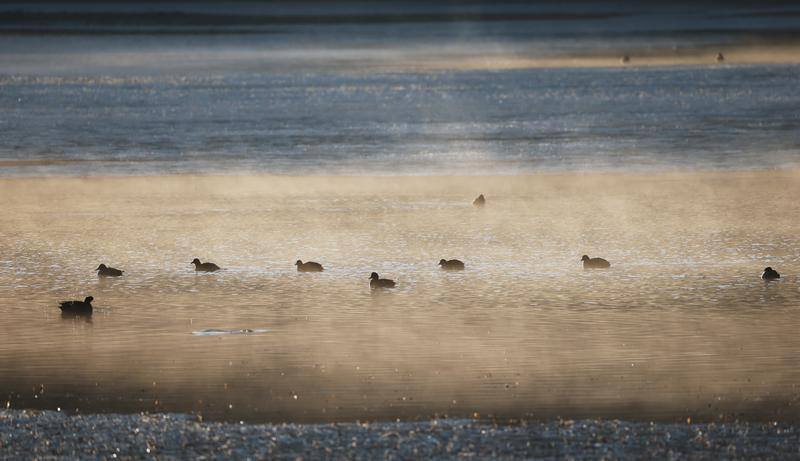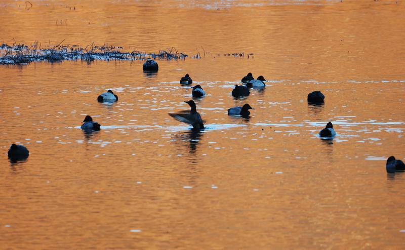 各类野鸭在湖中巡游,展现出一幅万物共生自然和谐的山水画卷。