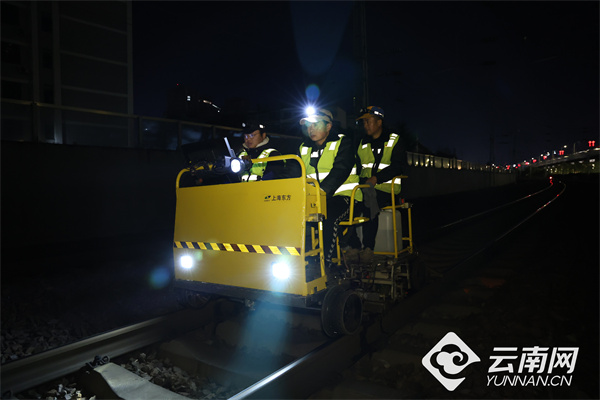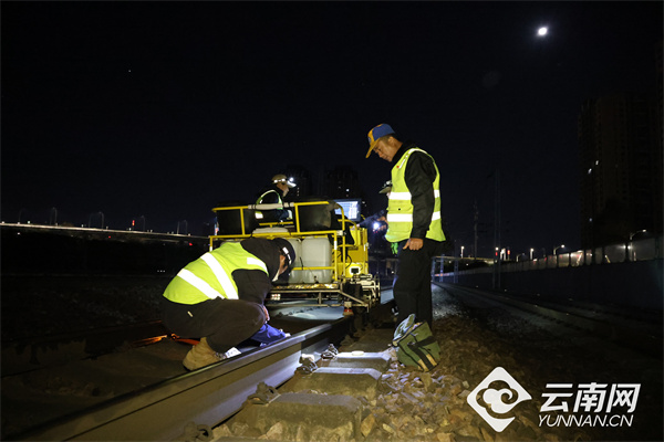 “注意脚下,一二三,起!”2月3日1时40分,广昆铁路昆明西客车场至昆明上下行区段线路封锁命令正式下达,中国铁路昆明局集团公司昆明工务段双轨探伤工区工长彭伟带领作业人员迅速行动,投入到紧张的钢轨“体检”作业中。