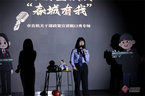 云南网讯(记者 赵岗)2月5日,昆明市政府办、市中级人民法院、市公安局、市财政局、市卫生健康委、市政府研究室、市市场监管局和市公积金管理中心8家单位的10名机关干部走上舞台,以脱口秀形式,用轻松幽默的语言解读优化营商环境、民生保障等相关政策,300余名现场观众在欢笑中收获了知识、增进了理解。