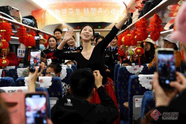 民警朱思洁伴着音乐舞步翩跹,裙摆随舞飞扬,旅客们都被她热情、甜美的笑容感染,站起身用掌声为她打着拍子。歌曲演唱环节更是温情满满,民警倪荣子献唱经典歌曲《灯火里的中国》,台下旅客深受触动,情不自禁跟着合唱,歌声与掌声交织,温暖了整个车厢。