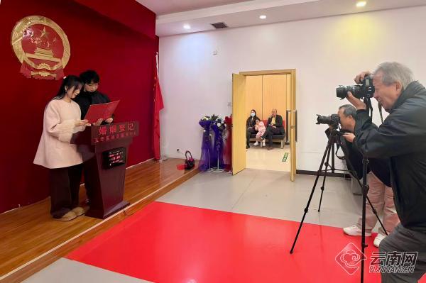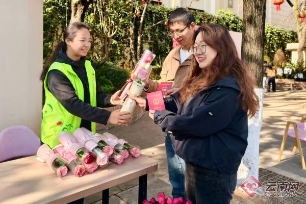 2月14日,昆明市五华区的婚姻登记处涌动着一股别样的幸福暖流。为应对节前婚姻登记小高峰,五华区委组织部、区民政局、区政务服务管理局、大观街道三合营社区联动发力,推出免费拍纪念照、新春送春联、义务婚前辅导、爱心赠玫瑰等系列暖心服务,让当日前来办理登记的新人,收获甜蜜回忆。