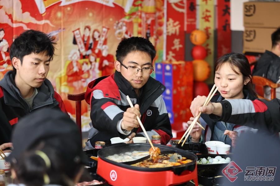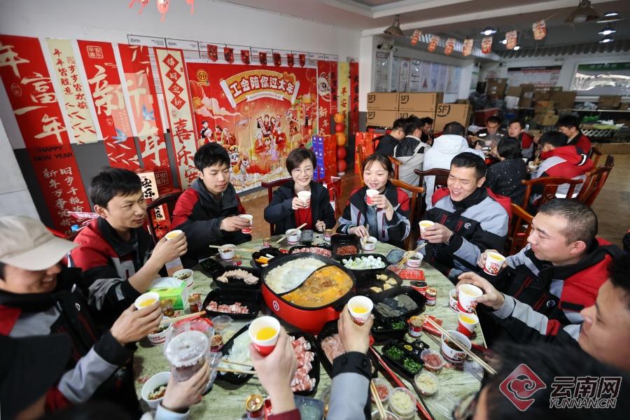 2月16日,昆明市盘龙区顺丰速运茶花宾馆速运营业站内洋溢着欢声笑语,20余名快递小哥齐聚一堂,吃一顿热气腾腾的年夜饭,喜迎新春佳节。