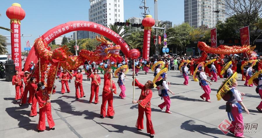 晋宁区2026年春节“民俗大拜年”暨“非物质文化遗产项目”巡游在昆阳街道永乐大道盛大举办。