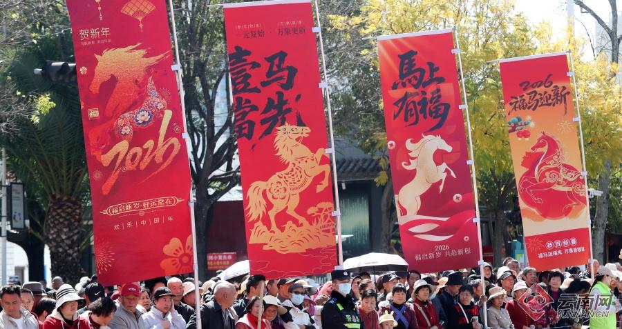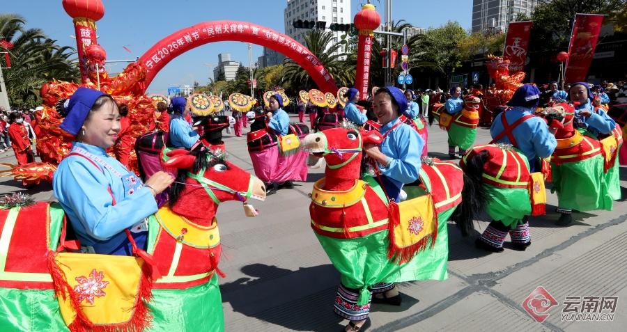 2月17日(大年初一),昆明市晋宁区2026年春节“民俗大拜年”暨“非物质文化遗产项目”巡游在昆阳街道永乐大道盛大举办,来自全区各街道和乡镇的表演方阵用舞龙耍狮、秧佬鼓、板凳龙、毛驴灯、白鹤舞等十余项非遗代表性项目和民俗巡游,上演了一场热气腾腾、年味十足的民间艺术大联欢,点燃了晋宁的马年新春氛围,让市民游人沉浸式感受传统文化的独特魅力。当天,晋宁区还联动开展“新春游园会”“猜灯谜赢福气”主题活动,以马年生肖文化为纽带,融合非遗传承与趣味互动,为市民游客奉上一场热闹纷呈、记忆深刻的年味盛宴。