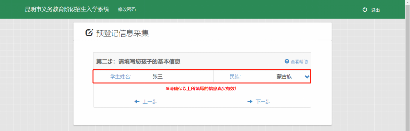根据系统要求,填写孩子姓名、民族(性别及出生日期为系统自动识别,无须填写)。如下图: