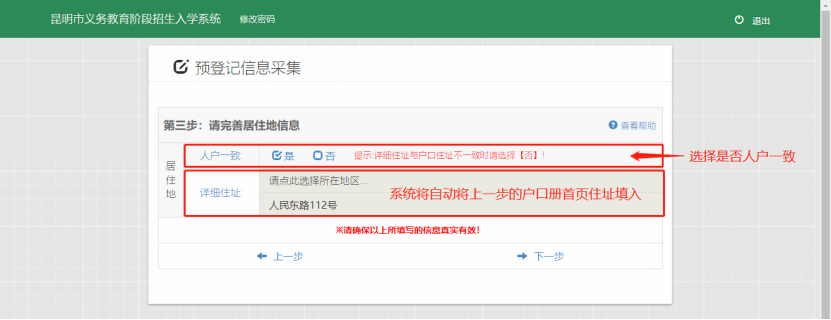选择“是否人户一致”,如选择“是”,系统会将上一步所填写的户口册首页住址自动填入,此时无需再进行填写。如下图: