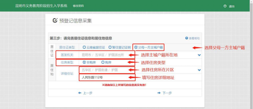 注意:居住地所属县区和居住证(或主城户籍)签发机关所属县区应该一致。(如:居住证签发机关或父母一方户口所属五华区,那么在选择居住地片区时就只能选择五华区辖区内的街道和社区)。