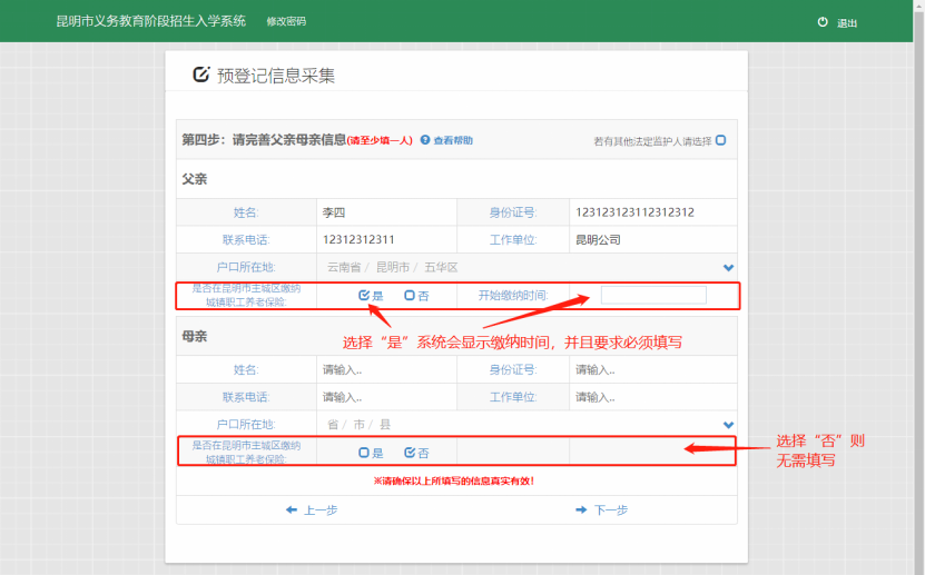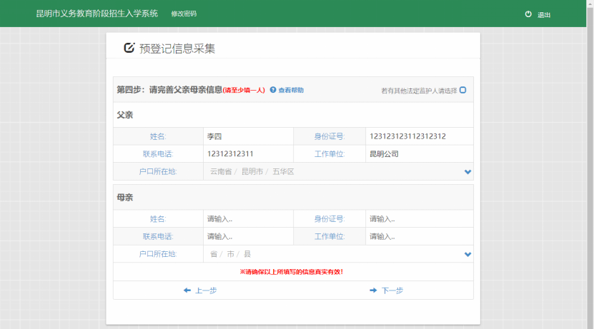 根据系统要求填写家长信息,要求至少填写一人。如下图: